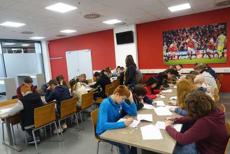 Nachdem die beiden Referenten der IKK Südwest eine kleine Einführung gaben, stand ein ca. 20-minütiger Einstellungstest auf dem Plan, bei dem die Zehntklässler in verschiedenen Themenbereichen wie z. B. Deutsch, Mathe und Allgemeinbildung abgefragt wurden. Die Ergebnisse wurden gemeinsam besprochen und im Anschluss hatten freiwillige Schüler die Möglichkeit, ein fiktives Bewerbungsgespräch durchzuführen.