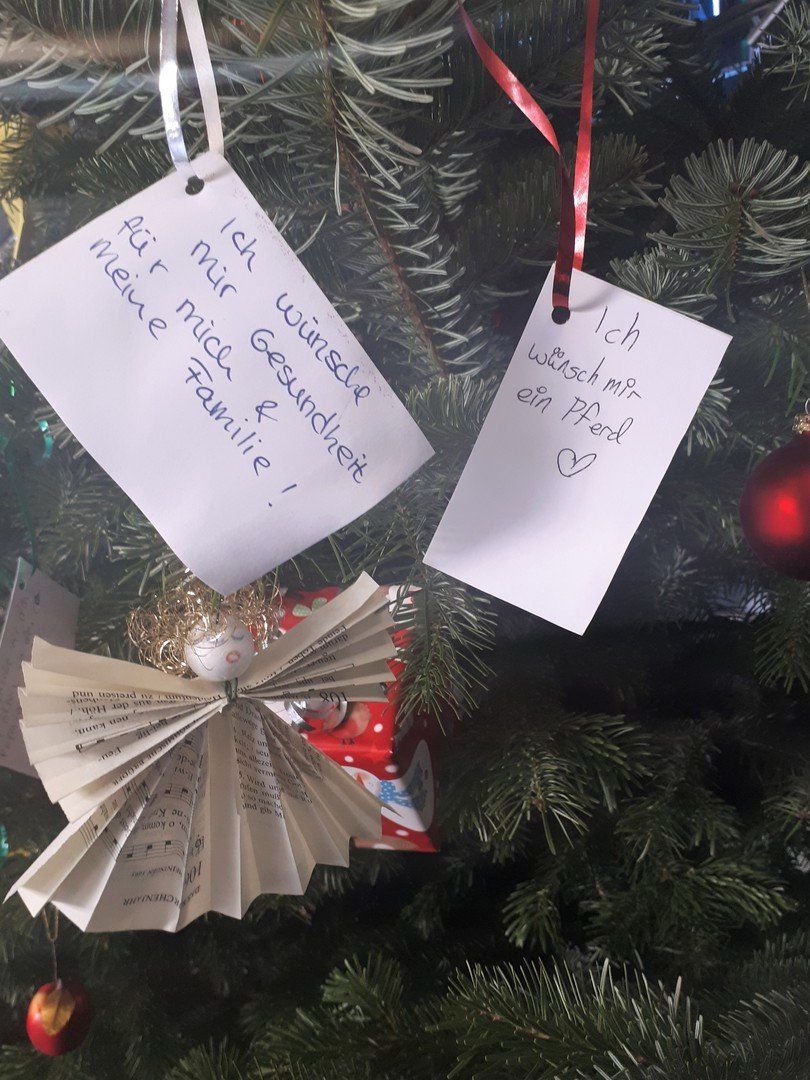 Außerdem wurden Wunschkarten gebastelt. Auf diese Karten konnten alle Schülerinnen und Schüler der Schule und auch Besucher vom Tag der offenen Tür Wünsche notieren und diese an den Baum hängen. So entstand aus einem geschmückten Weihnachtsbaum gleichzeitig ein individueller Wunschbaum der Schule.